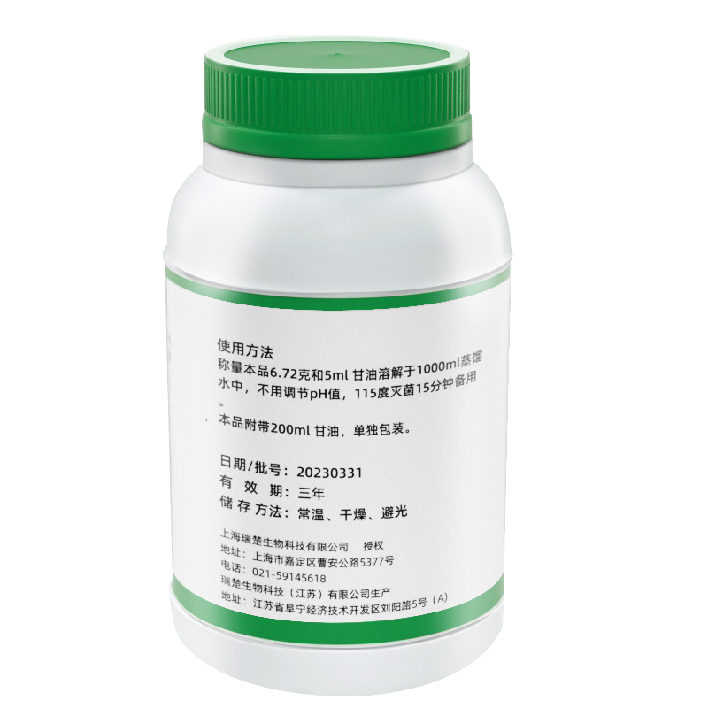使用說明(míng):稱量本品6.72克和(hé)5ml 甘油溶解于1000ml蒸餾水(shuǐ)中,不用調節pH值,115度滅菌15分鍾備用。